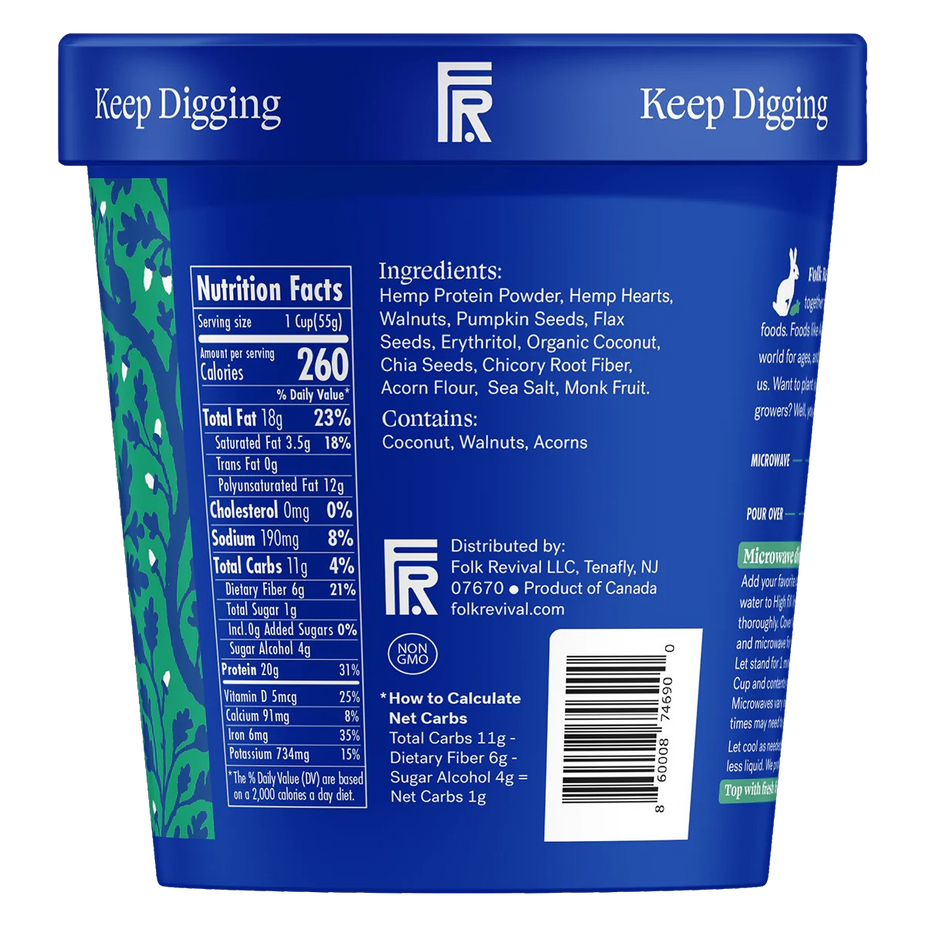 Ingredients: Hemp Protein Powder, Hemp Hearts, Walnuts, Pumpkin Seeds, Flax Seeds, Erythritol, Organic Coconut, Chia Seeds, Chicory Root Fiber, Acorn Flour, Sea Salt, Monk Fruit