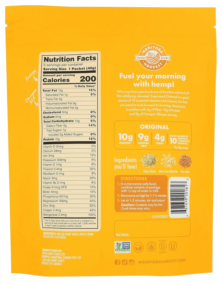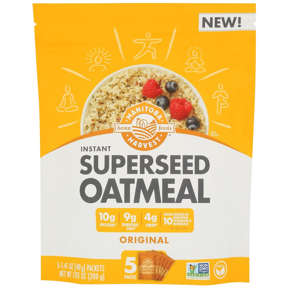 Manitoba Harvest Original Instant Superseed Oatmeal is a nutrient-packed breakfast blend featuring hemp hearts, flax seeds, and whole grain oats.