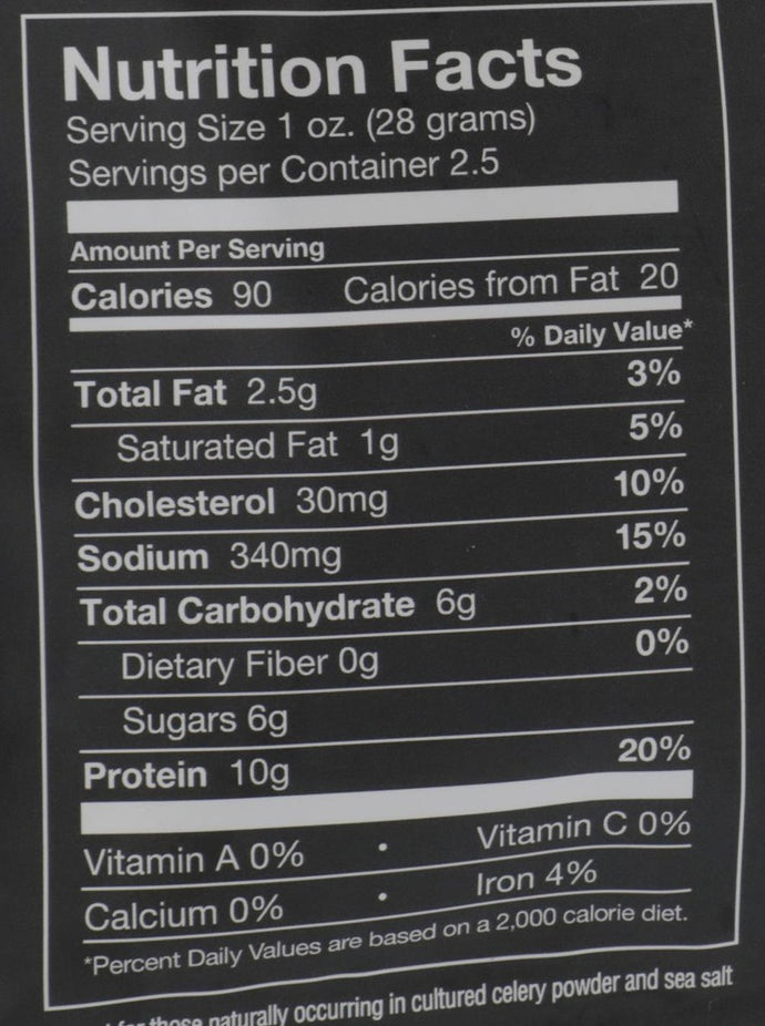 Ingredients: Beef, Soy Sauce (Water, Sugar, Salt, Hydrolyzed Corn And Soy Protein, Caramel Color, Natural Flavor, Cultured Dextrose, Lactic Acid, Green Tea Extract, Mustard Oil), Sugar, Worcestershire Sauce (Distilled White Vinegar, Molasses, Sugar, Water, Salt, Onions, Anchovies, Garlic, Cloves, Tamarind Extract, Natural Flavorings, Chili Pepper Extract), Horseradish (Horseradish Roots, Vinegar, Salt And Mustard Oil), Liquid Smoke (Water, Natural Hickory Smoke Flavor, Vinegar, Molasses, Caramel Color And Salt), Less Than 2%: Cultured Celery Powder, Sea Salt, Black Pepper, Red Pepper.