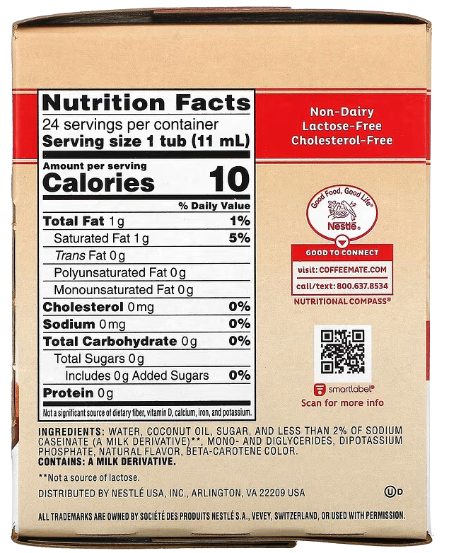Ingredients: Water, Coconut Oil, Sugar, And Less Than 2% Of Sodium Caseinate (A Milk Derivative)**, Mono- And Diglycerides, Dipotassium Phosphate, Natural Flavor, Beta Carotene Color.