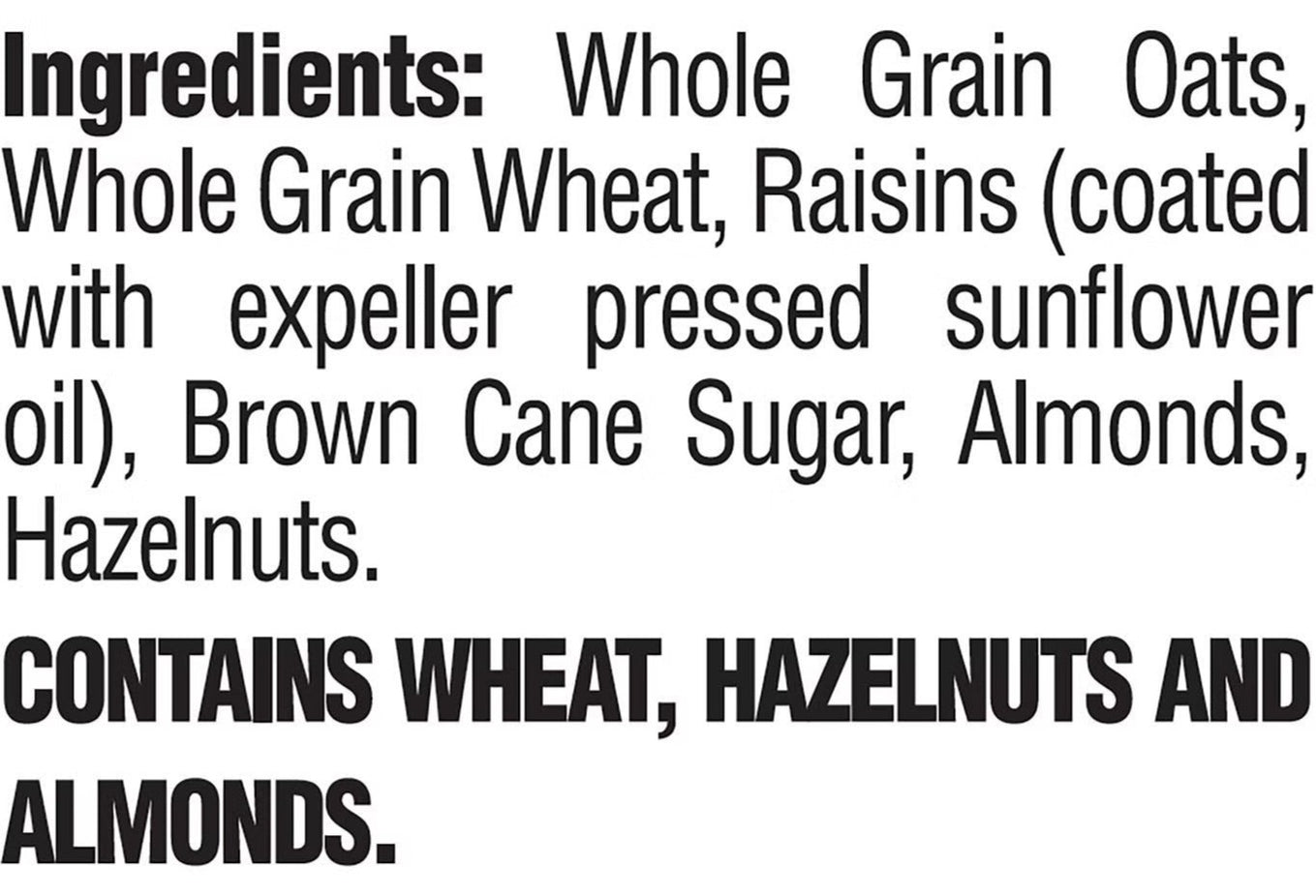Whole Grain Oats, Whole Grain Wheat, Raisins (Coated With Expeller Pressed Sunflower Oil), Brown Cane Sugar, Almonds, Hazelnuts.