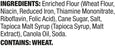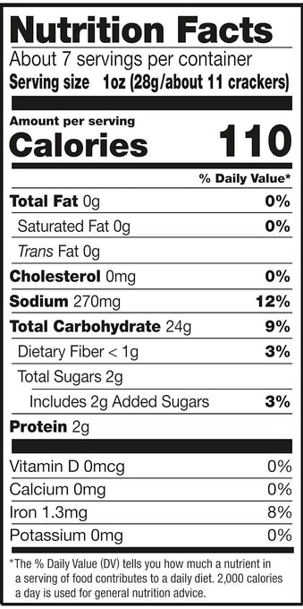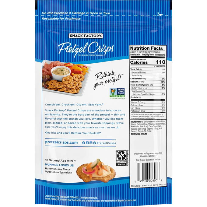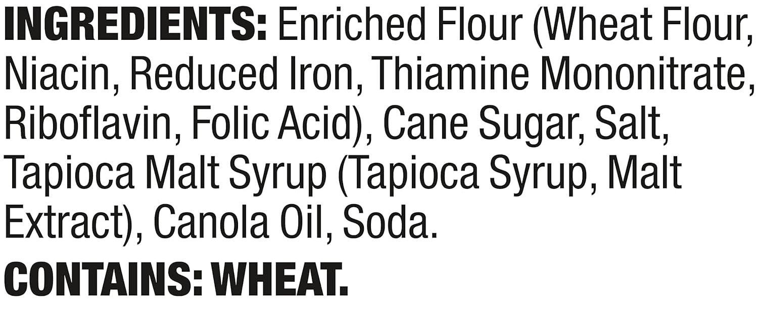 Ingredients: Enriched Flour (Wheat Flour, Niacin, Reduced Iron, Thiamine Mononitrate, Riboflavin, Folic Acid), Cane Sugar, Salt, Tapioca Malt Syrup (Tapioca Syrup, Malt Extract), Canola Oil, Soda. Contains: Wheat.