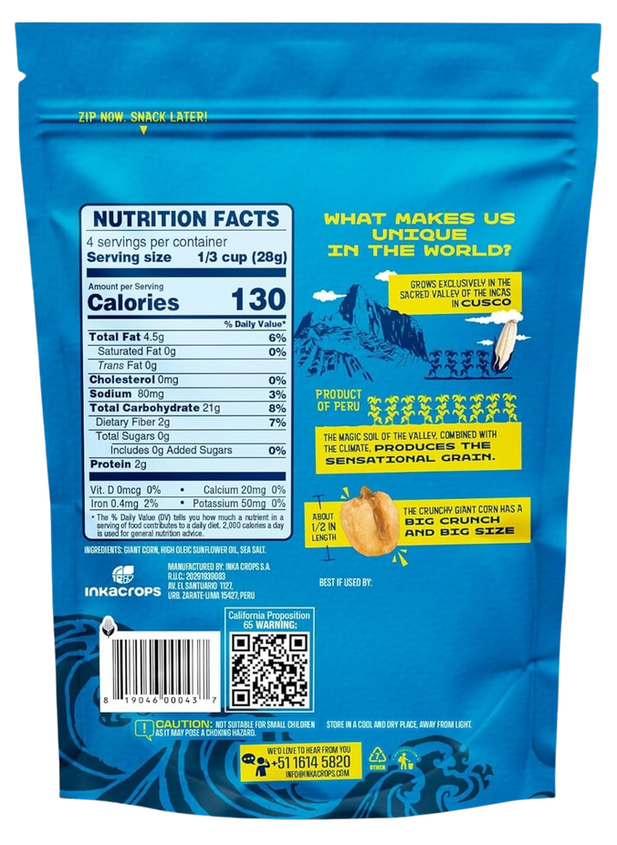 The Original Roasted Giant Corn is a deliciously salty, ultra-crunchy snack made from the legendary giant corn of the Incas.