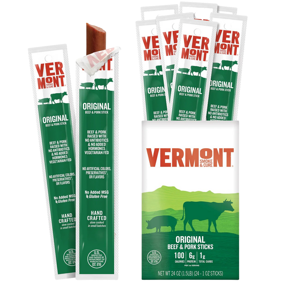 Vermont Original Beef & Pork Sticks are a fan-favorite snack made with simple ingredients like fresh cracked pepper, garlic, and mustard seed for bold, easy snacking flavor. Crafted from meats raised without antibiotics or added hormones, these sticks are free from major allergens, MSG, and gluten.