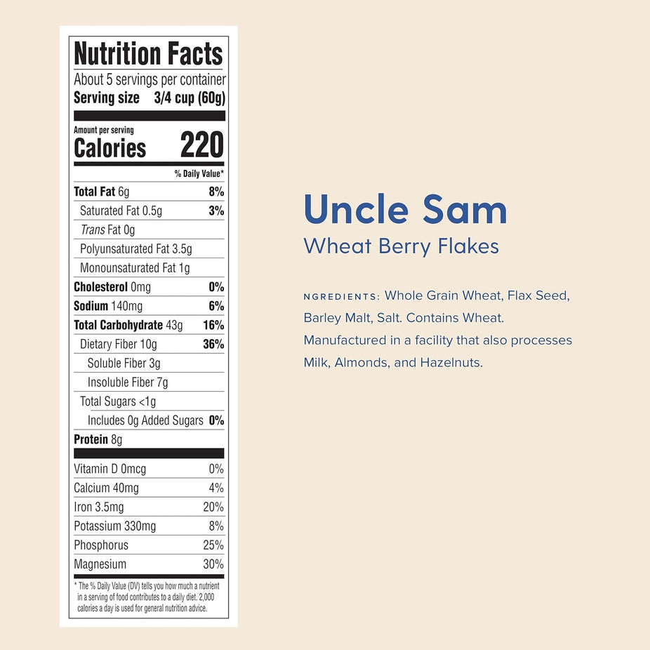 Uncle Sam Original Wheat Berry Flakes Cereal is a timeless breakfast classic, packed with whole berry flakes and flaxseed for a nutritious start to your day.