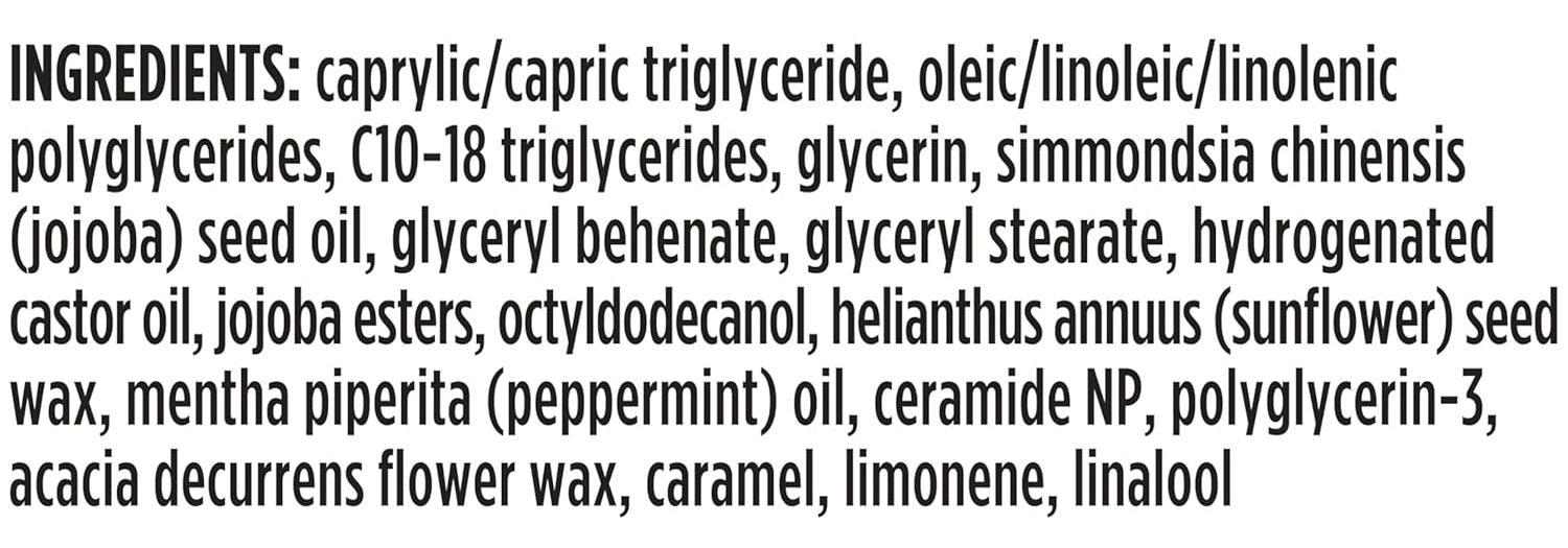 Ingredients: Caprylic/capric Triglyceride, Oleic/linoleic/linolenic Polyglycerides, C10-18 Triglycerides, Glycerin, Simmondsia Chinensis (Jojoba) Seed Oil, Glyceryl Behenate, Glyceryl Stearate, Hydrogenated Castor Oil, Jojoba Esters, Octyldodecanol, Helianthus Annuus (Sunflower) Seed Wax, Ceramide Np, Mentha Piperita (Peppermint) Oil, Caramel, Acacia Decurrens Flower Wax, Polyglycerin-3, Limonene, Linalool.