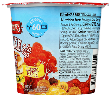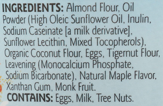 Ingredients: Almond Flour, Oil Powder (High Oleic Sunflower Oil, Inulin, Sodium Caseinate [A Milk Derivative], Sunflower Lecithin, Mixed Tocopherols), Organic Coconut Flour, Eggs, Tigernut Flour, Leavening (Monocalcium Phosphate, Sodium Bicarbonate), Natural Maple Flavor, Xanthan Gum, Monk Fruit.