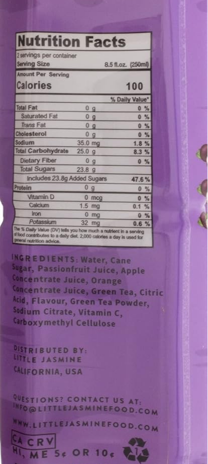 Indulge in the vibrant and juicy flavor of Little Jasmine's Passion Fruit Green Tea, made with real passion fruit juice and sweetened with pure cane sugar.