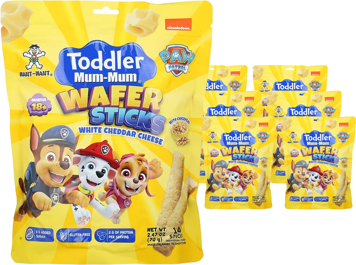 Toddler Mum-Mum Paw Patrol Wafer Sticks in Cheddar Cheese flavor combine fun and nutrition with plant-based ingredients and a savory taste kids adore.
