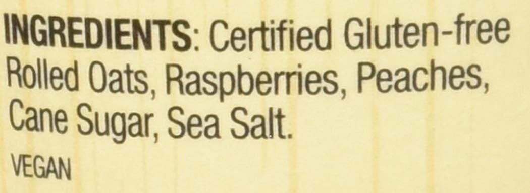 Ingredients: Certified Gluten-Free Rolled Oats Raspberries, Peaches, Organic Cane Sugar, Sea Salt.
