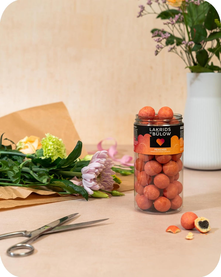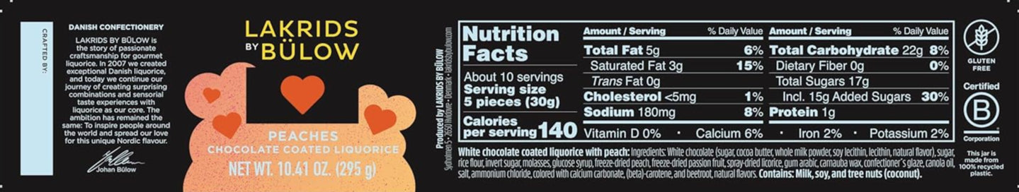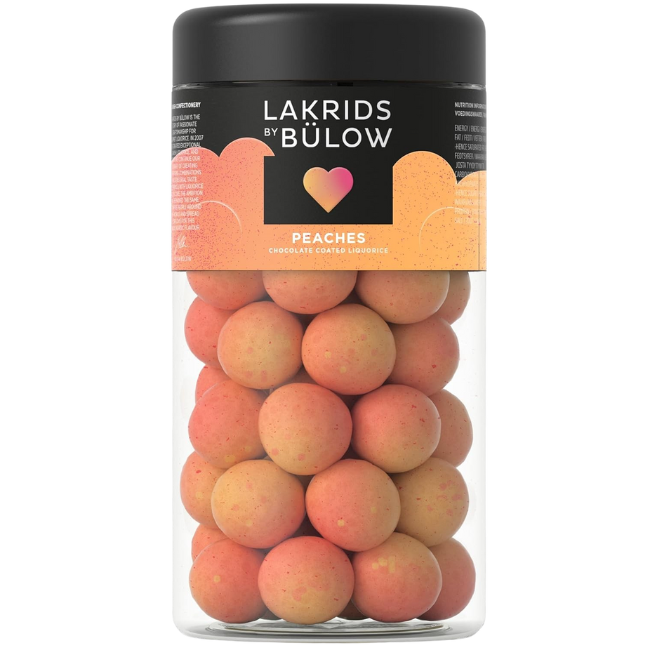 LAKRIDS BY BÜLOW Peaches Chocolate Coated Gourmet Licorice delivers a royal fusion of fruity sweetness and indulgent decadence.