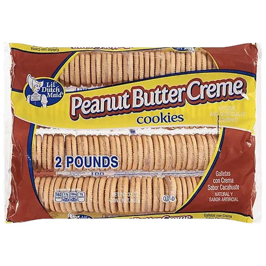 Little Dutch Maid peanut butter crème sandwich cookies blend creamy peanut butter and sweet crème between crisp oatmeal cookies for a timeless treat.