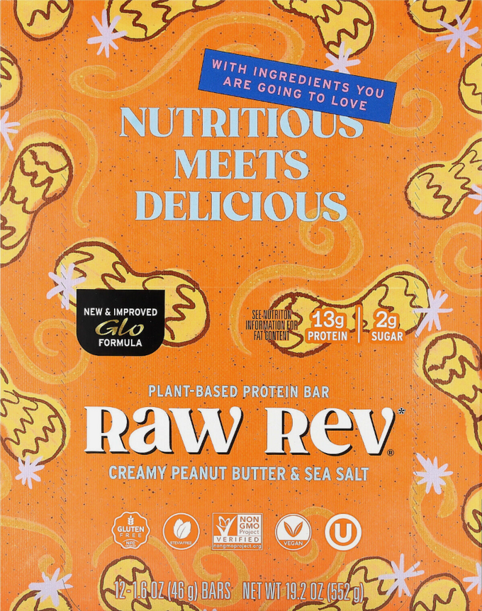 Raw Rev Peanut Butter Dark Chocolate & Sea Salt Protein Bars deliver creamy peanut butter flavor with rich dark chocolate and a touch of sea salt in a satisfying, better-for-you bar.