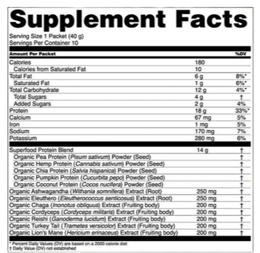 Ingredients: Organic Peanut Protein, Organic Pea Protein, Organic Coconut Palm Sugar, Organic Yacon Juice Powder, Sea Salt, Organic Hemp Protein, Organic Chia Protein, Organic Pumpkin Protein, Organic Coconut Protein, Organic Ashwagandha Extract, Organic Eleuthero, Organic Turkey Tail, Organic Cordyceps, Organic Lion'S Mane, Organic Chaga, Organic Reishi