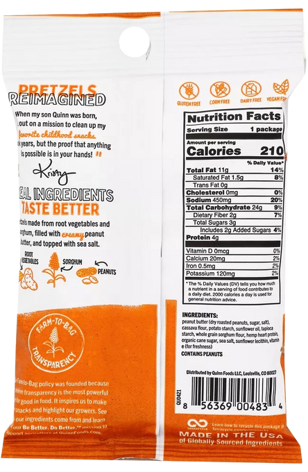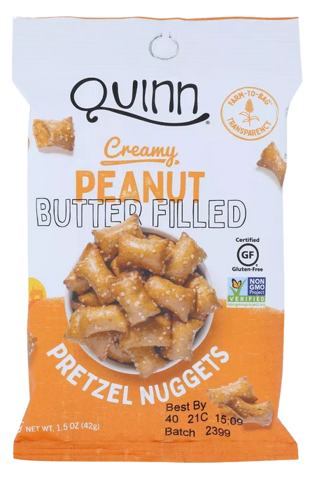 Quinn Snacks Peanut Butter Pretzel Nuggets deliver a crunchy, gluten-free snack filled with creamy peanut butter for a satisfying treat.