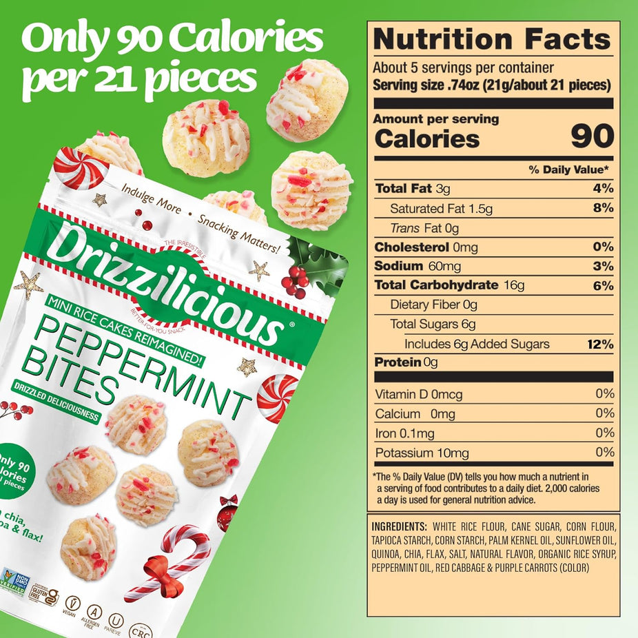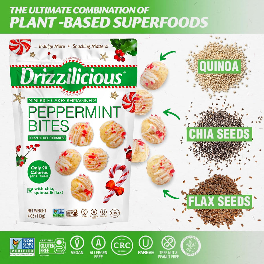 - A HEALTHIER HOLIDAY TREAT - Our delectable Peppermint Rice Cake Bites are the perfect cozy holiday treat for pairing with hot cocoa! Made with quinoa and chia, and drizzled in white chocolate sauce