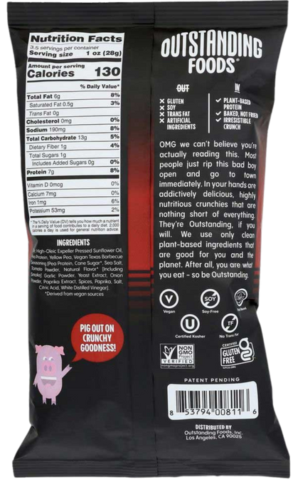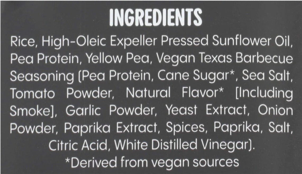 Ingredients: Rice, High-Oleic Expeller Pressed Sunflower Oil, Pea Protein, Pea Grits, Texas Barbecue Seasoning (Pea Protein, Cane Sugar (Derived From Vegan Sources), Sea Salt, Tomato Powder, Natural Flavor (Derived From Vegan Sources), [Including Smoke], Garlic Powder, Yeast Extract, Onion Powder, Paprika Extract, Spices, Paprika, Salt, Citric Acid, White Distilled Vinegar).