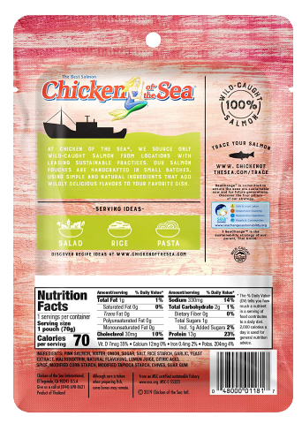 Ingredients: Pink Salmon, Water, Salt, Onion, Sugar, Rice Starch, Modified Corn Starch, Garlic, Yeast Extract, Maltodextrin, Modified Tapioca Starch, Lemon Juice , Natural Flavoring, Citric Acid, Olive Oil, Spices, Guar Gum, Lemon Oil, Chive