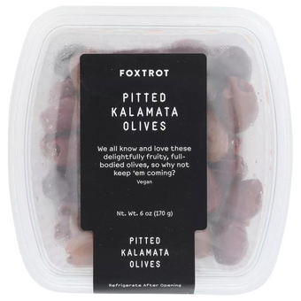Foxtrot Pitted Kalamata Olives are full-bodied olives that are delightfully fruity. These vegan olives are perfect for snacking.