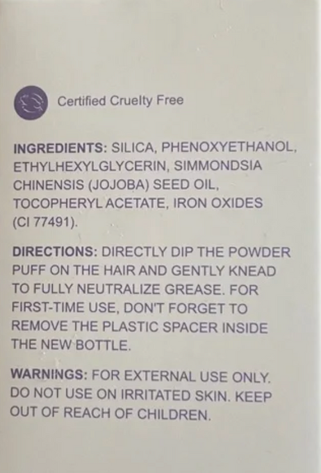 Ingredients: SILICA, PHENOXYETHANOL, ETHYLHEXYLGLYCERIN, SIMMONDSIA CHINENSIS (JOJOBA) SEED OIL, TOCOPHERYL ACETATE, IRON OXIDES (CI 77491). WARNINGS: FOR EXTERNAL USE ONLY. DO NOT USE ON IRRITATED SKIN. KEEP OUT OF REACH OF CHILDREN.