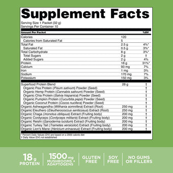 Ingredients: Organic Pea Protein Powder, Organic Hemp Protein Powder, Organic Chia Protein Powder, Organic Pumpkin Protein Powder, Organic Coconut Protein Powder, Organic Ashwagandha, Organic Eleuthero, Organic Cordyceps, Organic Lion'S Mane, Organic Reishi, Organic Turkey Tail, Organic Chaga, Organic Lucuma , Organic Coconut Palm Sugar, Pink Himalayan Salt, Organic Cinnamon, Organic Monk Fruit