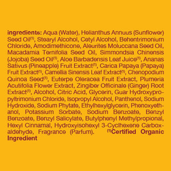 Ingredients: Water (Aqua), Helianthus Annuus (Sunflower) Seed Oil(1), Cetyl Alcohol, Stearyl Alcohol, Behentrimonium Chloride, Aleurites Moluccana Seed Oil, Macadamia Ternifolia Seed Oil, Simmondsia Chinensis (Jojoba) Seed Oil(1), Aloe Barbadensis Leaf Juice(1), Ananas Sativus (Pineapple) Fruit Extract(1), Camellia Sinensis Leaf Extract(1), Carica Papaya (Papaya) Fruit Extract(1), Euterpe Oleracea Fruit Extract, Plumeria Acutifolia Flower Extract, Zingiber Officinale (Ginger) Root Extract(1), Ascorbyl Palmitate, Panthenol, Tocopherol, Citric Acid, Glycerin, Guar Hydroxypropyltrimonium Chloride, Hydrolyzed Soy Protein, Isopropyl Alcohol, Sodium Hydroxide, Sodium Phytate, Alcohol, Ethylhexylglycerin, Phenoxyethanol, Potassium Sorbate, Sodium Benzoate, Benzyl Benzoate, Benzyl Salicylate, Citronellol, Fragrance (Parfum), Hexyl Cinnamal. (1)certified Organic Ingredient