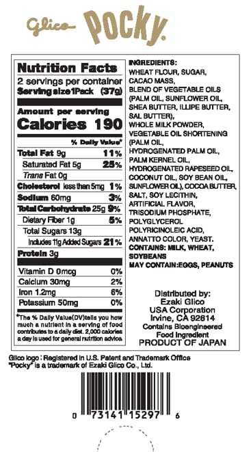 Ingredients: Wheat Flour, Sugar, Cacao Mass, Blend of Vegetable Oils (Palm Oil, Sunflower Oil, Shea Butter, Illipe Butter, Sal Butter), Whole Milk Powder, Vegetable Oil Shortening (Palm Oil, Hydrogenated Palm Oil, Palm Kernel Oil, Hydrogenated Rapeseed Oil, Coconut Oil, Soybean Oil, Sunflower Oil), Cocoa Butter, Salt, Soy Lecithin, Artificial Flavor, Trisodium Phosphate, Polyglycerol Polyricinoleic Acid, Annatto Color, Yeast.