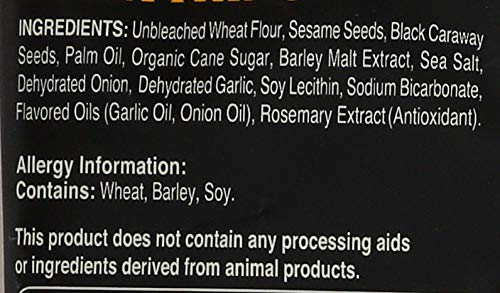 Ingredients: Unbleached Wheat Flour , Sesame Seeds , Black Caraway Seeds , Non Gmo , Palm Oil , Organic Cane Sugar , Barley Malt Extract , Sea Salt , Dehydrated Onion , Dehydrated Garlic , Soy Lecithin , Sodium Bicarbonate , Flavoured Oils ( Garlic Oil , Onion Oil ) , Rosemary Extract