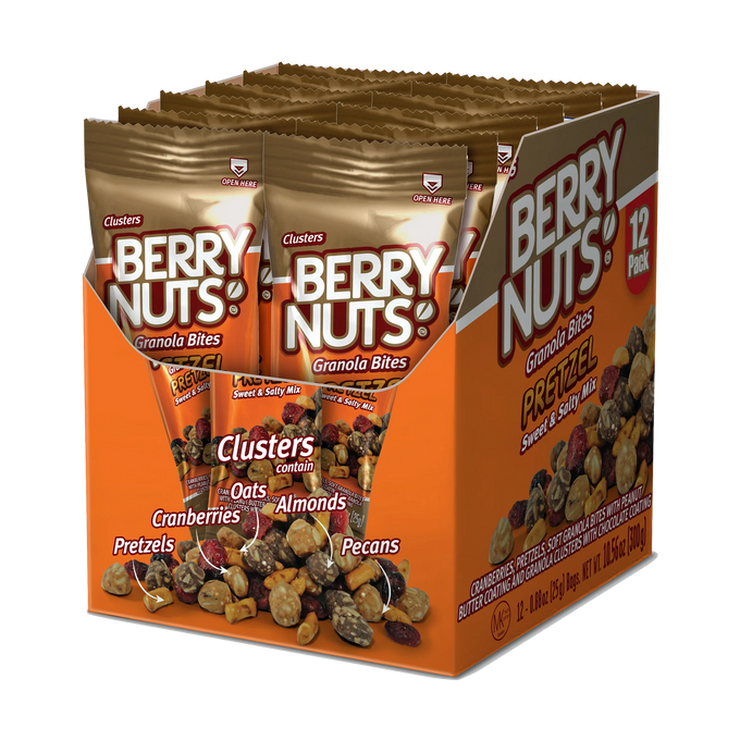 Ingredients: Granola (Oats, Coconut, Almond, Pecan, Canola Oil, Amaranth, Vanilla Extract, Cinnamon, D-alpha Tocopherol [antioxidant]), Cranberries, Pretzels(Enriched Wheat Flour With Niacin(Vitamin B1), Riboflavin (Vitamin B2), Folic Acid),corn Syrup, Iodized Salt, Canola Oil, Sodium Bicarbonate, Yeast Extract), Peanut Butter Coating (Sugar, Palm Kernel Oil, Palm Oil, Partially Defatted Peanut Flour, Skim Milk Solids, Whey Powder, Peanuts, Salt, Soy Lecithin [emulsifier]), Chocolate Flavored Coating (Sugar, Hydrogenated Palm Kernel Oil, Cocoa(Processed With Alkali), Soy Lecithin, Iodized Salt, Vanillin).