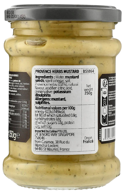 Ingredients: Water, Mustard Grains, Wine Vinegar, Salt, Provence Herbs (0.8%), Natural Flavor, Acid: Citric Acid, Preservative: Potassium Bisulphite (Sulphites).