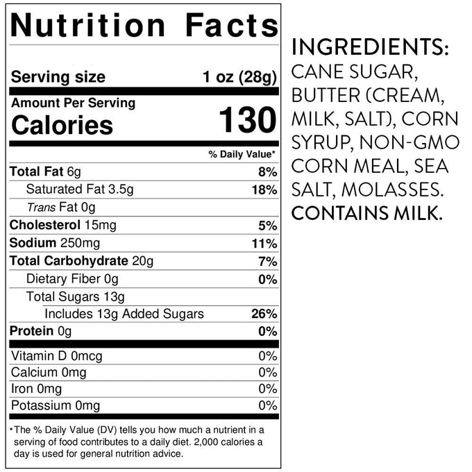 Ingredients: Cane Sugar, Butter (Cream, Milk, Salt), Corn Syrup, Degerminated Yellow Corn Meal, Sea Salt, Molasses, Vanilla Extract, Baking Soda.Allergenics Caution: Processed In A Facility That Uses Dairy Products And Tree Nuts.
