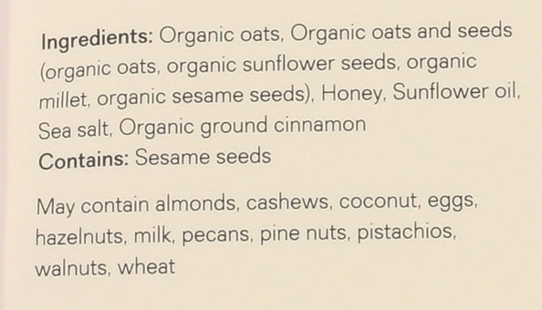 Ingredients: Organic Oats, Organic Oats And Seeds (Organic Oats, Organic Sunflower Seeds, Organic Millet, Organic Sesame Seeds), Honey, Sunflower Oil, Organic Cinnamon, Sea Salt.