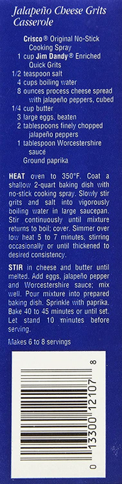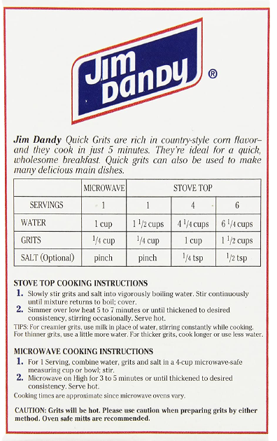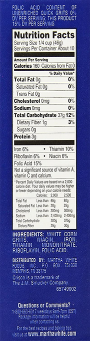 Ingredients: White Corn Grits, Niacin, Iron, Thiamin Mononitrate, Riboflavin, Folic Acid.'