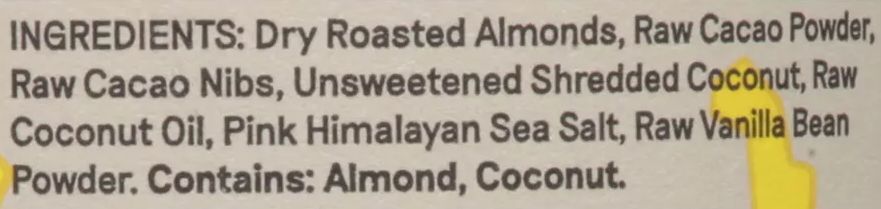 Ingredients: Dry Roasted Almonds, Raw Cacao Powder, Raw Cacao Nibs, Unsweetened Shredded Coconut, Raw Coconut Oil, Pink Himalayan Sea Salt, Raw Vanilla Bean Powder.