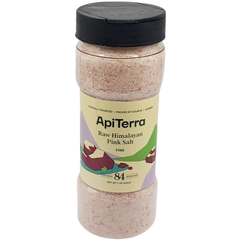 ApiTerra Raw Himalayan Pink Salt in a convenient shaker is rich in minerals and ideal for everyday seasoning.
