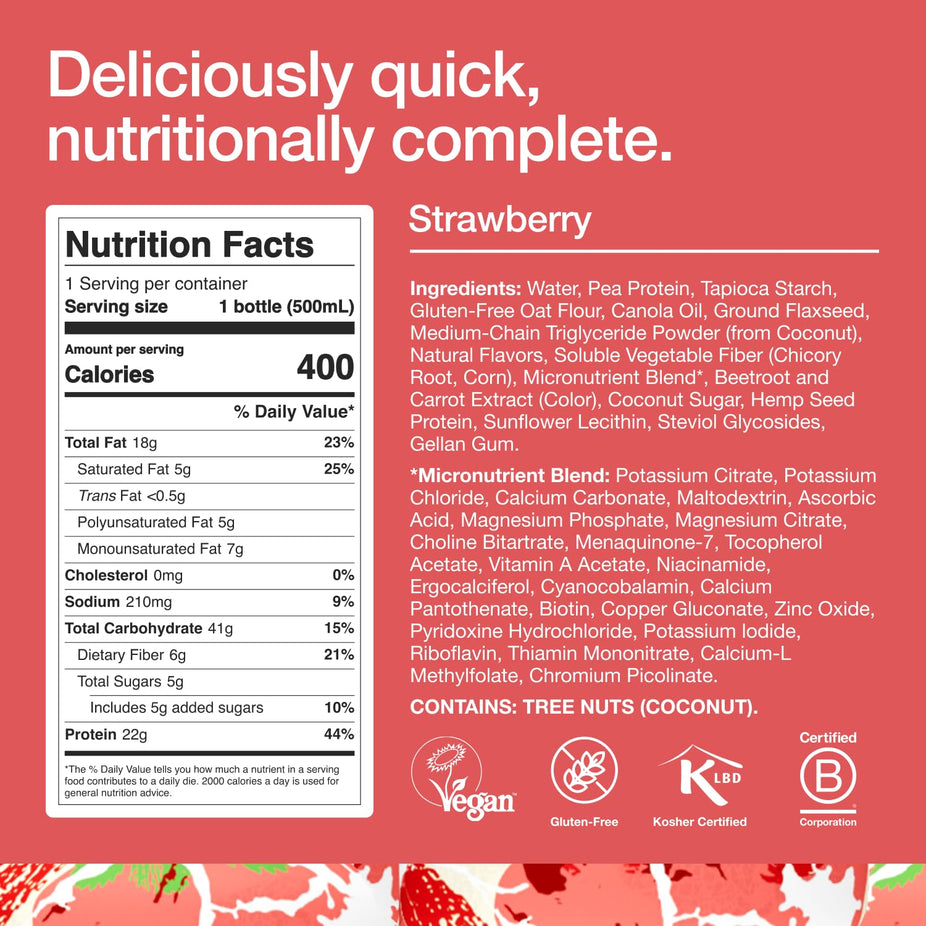 Ingredients: Water, Pea Protein, Tapioca Maltodextrin, Gluten-free Oat Flour, Rapeseed Oil, Ground Flaxseed, Medium-chain Triglyceride Powder (From Coconut), Natural Flavourings, Corn Fibre, Micronutrient Blend*, Beetroot And Carrot Extract, Coconut Sugar, Hemp Seed Protein, Emulsifier: Sunflower Lecithin, Sweetener: Steviol Glycosides, Thickener: Gellan Gum. *micronutrient Blend: Potassium Citrate, Potassium Chloride, Calcium Carbonate, Maltodextrin, Vitamin C (As L-ascorbic Acid), Magnesium Phosphate, Magnesium Citrate, L-choline Bitartrate, Vitamin K2 (As Menaquinone-7), Vitamin E (As D-alpha-tocopheryl Acetate), Vitamin A (As Retinyl Acetate), Niacin (As Niacinamide), Vitamin D2, Vitamin B12 (As Cyanocobalamin), Pantothenic Acid (As Calcium-d-pantothenate), D-biotin, Copper Gluconate, Zinc Oxide, Vitamin B6 (As Pyridoxine Hydrochloride), Potassium Iodide, Riboflavin, Thiamin Mononitrate, Calcium-l-methylfolate Chromium Picolinate.