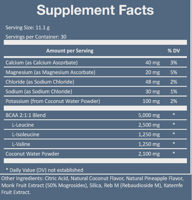 Ingredients: Calcium (As Calcium Ascorbate), Magnesium (As Magnesium Ascorbate), Chloride (As Sodium Chloride), Sodium (As Sodium Chloride), Potassium (From Coconut Water Powder), Bcaa 2:1:1 Blend (L-leucine, L-isoleucine, L-valine), Coconut Water Powder, Citric Acid, Natural Flavor, Monk Fruit Extract, Silica, Reb M, Katemfe Fruit Extract.