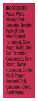 Ingredients: Water, White Vinegar, Red Jalapeno, Tomato Paste (Fresh Vine-Ripened Tomatoes), Cane Sugar, Garlic, Sea Salt, Tamarind Concentrate, Corn Starch, Spices (Coriander, Cumin, Black Pepper, Kashmiri Chili, Cinnamon, Clove, Cardamom).