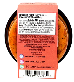 Ingredients: Roasted Red Peppers, Onions, Pickled Rep Peppers (Red Peppers, Sea Salt, Citric Acid), Feta Cheese (Pasteurized Sheep And Goat's Milk, Sea Salt, Rennet, Culture), Mizithra Cheese (Whey, Sea Salt), Extra Virgin Olive Oil, Sugar, Sea Salt, Red Wine Vinegar, Herbs And Spices.