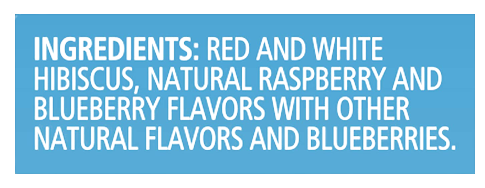 Ingredients: Red And White Hibiscus, Natural Raspberry And Blueberry Flavors With Other Natural Flavors And Blueberries.