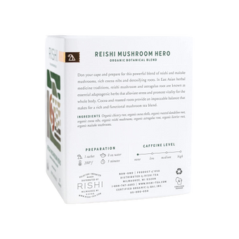 Don your cape and prepare for this powerful blend of reishi and maitake mushrooms, rich cocoa nibs and detoxifying roots. In East Asian herbal medicine traditions, reishi mushroom and astragalus root are known as essential adaptogenic herbs that alleviate stress and promote vitality for the whole body. Cocoa and roasted roots provide an impeccable balance that makes for a rich and functional mushroom tea blend.