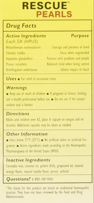 Ingredients: Active Ingredients: Rock Rose (Helianthemum Nummularium), Clematis (Clematis Vitalba), Impatiens (Impatiens Glandulifera), Cherry Plum (Prunus Cerasifera), Star Of Bethlehem (Ornithogalum Umbellatum). Inactive Ingredients: Carnauba Wax, Coconut Oil,m Gelatin (Fish), Grapeseed Oil, Natural Organge Flavor, Natural Vanilla Flavor, Pectin, Sorbitol.