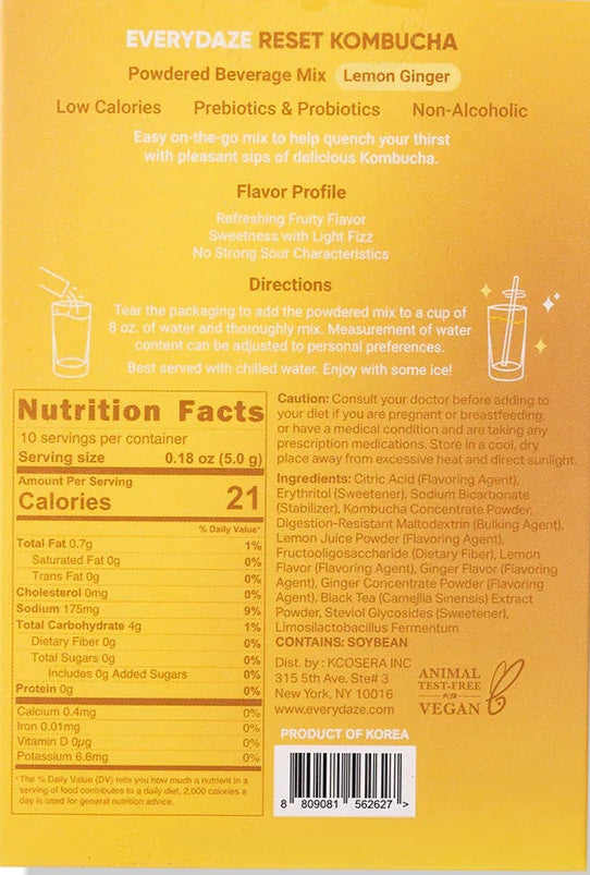 Everydaze Reset Kombucha Lemon Ginger is a refreshing, fruit-forward beverage powder mix that supports gut health with prebiotics and probiotics, perfect for a quick and satisfying reset.