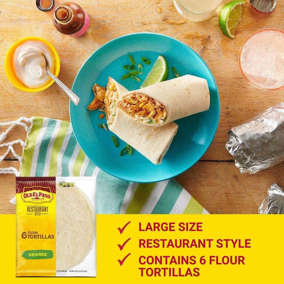 When you need a delicious foundation for burritos, fajitas and more, choose Old El Paso Restaurant Style Grande Flour Tortillas. These soft flour tortillas help get dinner on the table quickly. Get creative and wrap up your toppings in a grande tortilla wrap for the perfect giant burrito. When you have a package of these soft flour tortillas on hand, you're always ready for a fiesta. Stuff with Old El Paso rice and refried beans and your favorite Mexican food toppings.For more than 80 years, Old El Paso has been bringing families and communities together to celebrate old and new traditions around delicious, Mexican-inspired flavors. We believe that any night can be a taco night, and we’re here to help make it a little easier and a lot more delicious. Our variety of crispy hard taco shells, tasty soft tortillas, flavorful seasonings, and much more help make taco night fun.