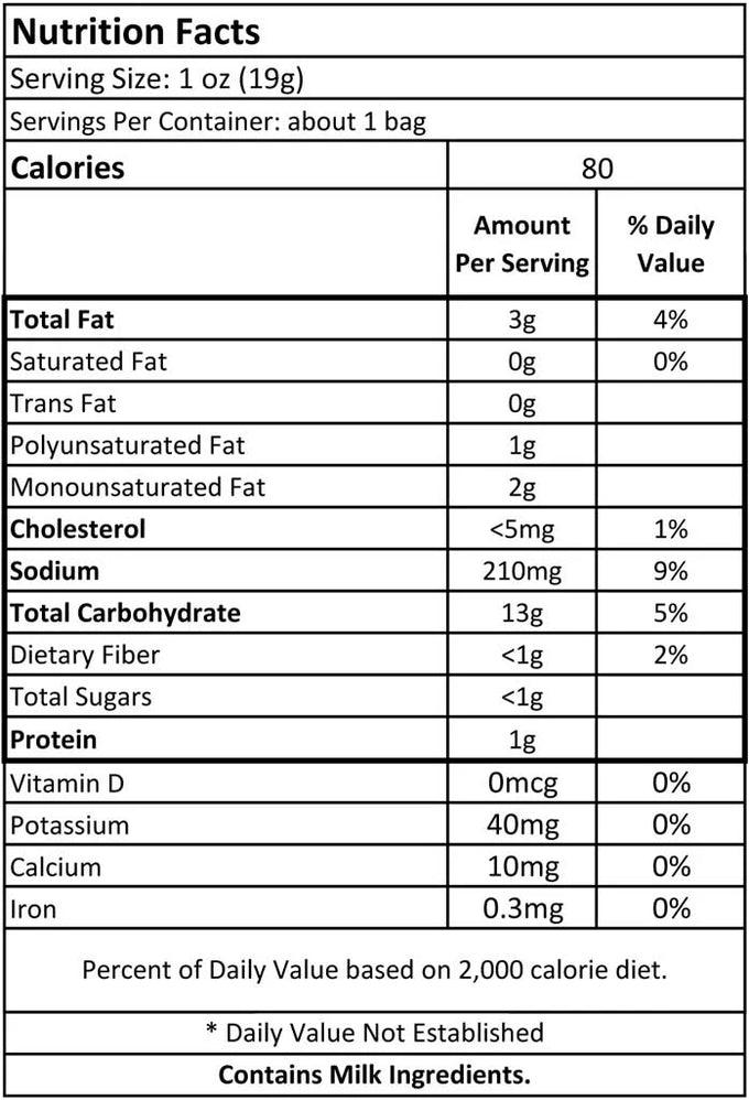 Ingredients: Whole Grain Brown Rice Flour, Degerminated Milled Corn, Sunflower Oil, Salt, Buttermilk Powder, Corn Maltodextrin, Palm Oil, Tomato Powder, Corn Syrup Solids, Dextrose, Onion Powder, Monosodium Glutamate, Garlic Powder, Sugar, Citric Acid, Dry Whey, Spices, Dipotassium Phosphate, Malic Acid, Sodium Acetate, Natural Flavor, Sodium Diacetate, Mono And Diglycerides, Tocopheros (Preservative), Gum Arabic Disodium Phosphate, Tricalcium Phosphate, Yellow 5 Lake, Disodium Inosinate, Disodium Guanylate, Red 40 Lake, Yellow 6 Lake.