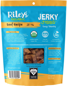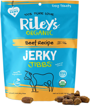 Riley's Organic Beef Jerky Jibbs are the perfect way to return the love your dog gives you every day. Certified Organic, Jibbs are low in calories and perfect for training. These delicious treats are given a four-paws vote of approval by dogs of all sizes. When you want to give your best friend the very best, make it Riley's.