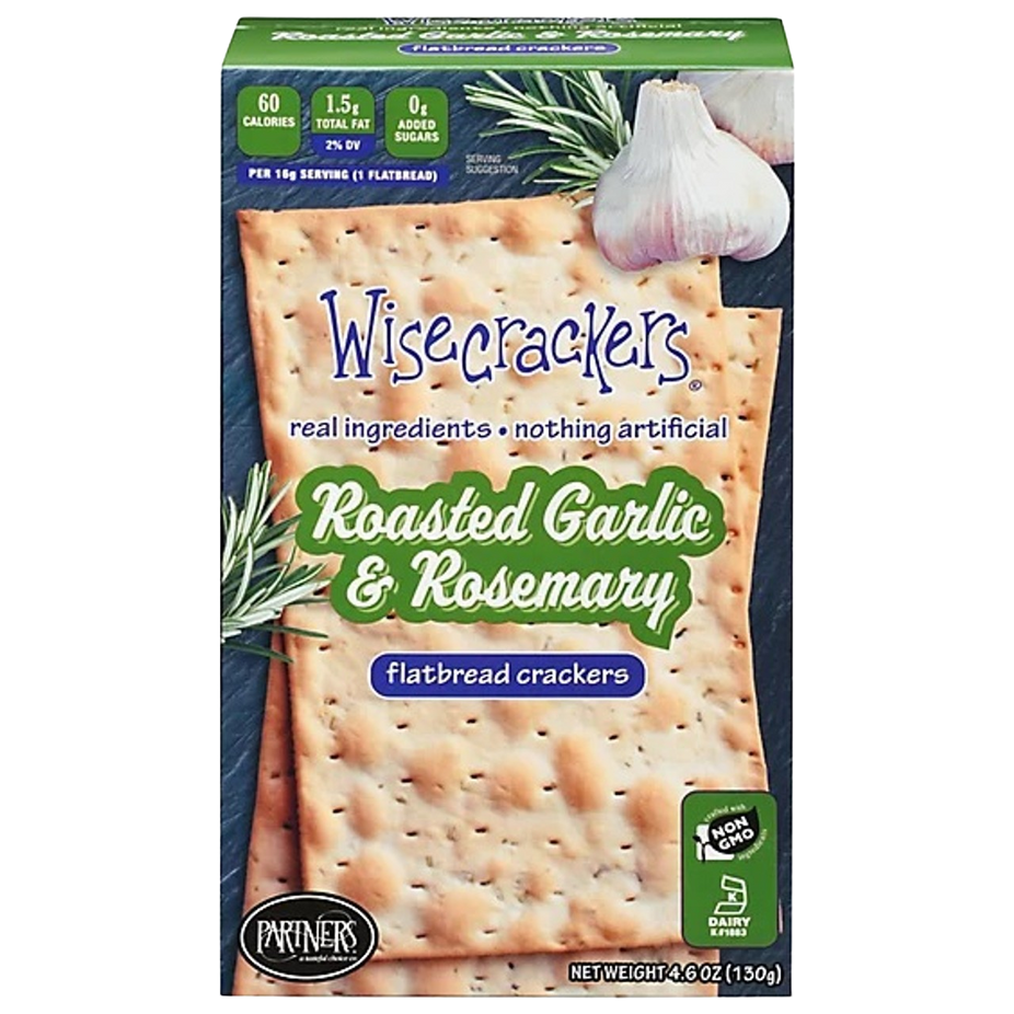 Ingredients: Enriched Unbleached Flour (wheat flour, malted barley flour, niacin, reduced iron, thiamine mononitrate, riboflavin, folic acid), Buttermilk (cultured low-fat milk, salt, sodium citrate), Expeller Pressed Non-GMO Canola Oil, Cane Sugar, Roasted Garlic, Sea Salt, Rosemary, Baking Soda. CONTAINS : Wheat and Milk. Processed on shared equipment with Sesame.
