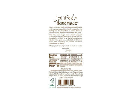 Ingredients: Unbleached/Unbromated Enriched Wheat Flour (Niacin, Reduced Iron, Thiamin Mononitrate, Riboflavin, Enzyme, Folic Acid), Water, Extra Virgin Olive Oil, Yeast, Rosemary, Kosher Salt, Sugar