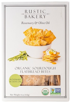 Rustic Bakery organic sourdough flatbread bites made with olive oil and aromatic rosemary. Flaky and savory, these artisan crackers are delicious with any kinds of cheese and spreads!
