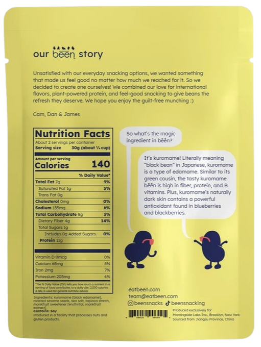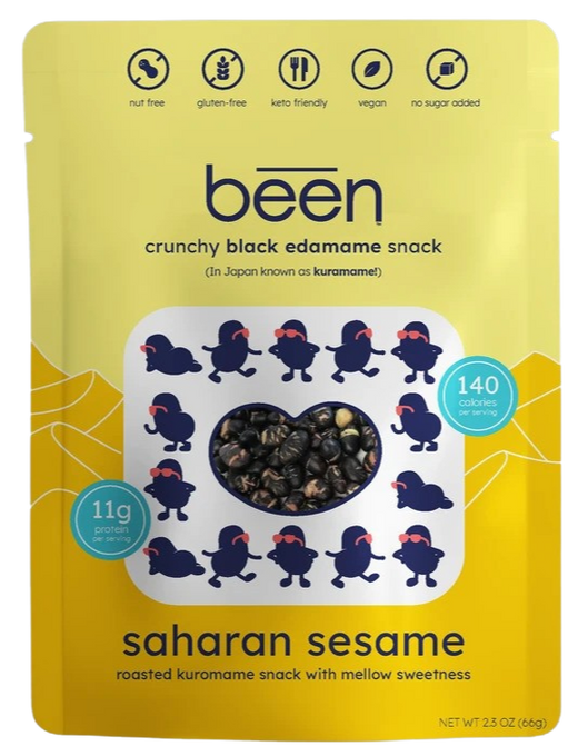 Bēēn is a brand of boldly seasoned, crunchy roasted ~black~ edamame. Saharan Sesame flavor packs the subtly sweet and savory crunchiness you'd expect from sesame crackers, but are ready to enjoy guilt-free.